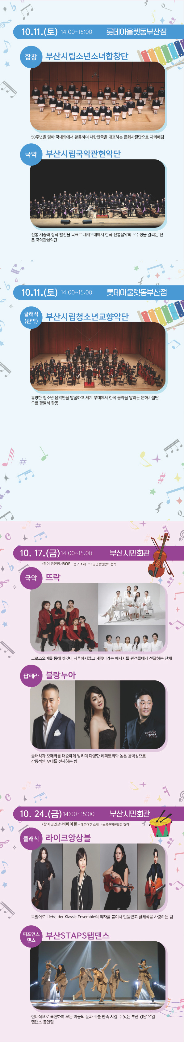 지역 예술인들의 생생한 무대와 부산시립예술단의 전문적인 공연을 동시에 만날 수 있는 흔치 않은 기회입니다.