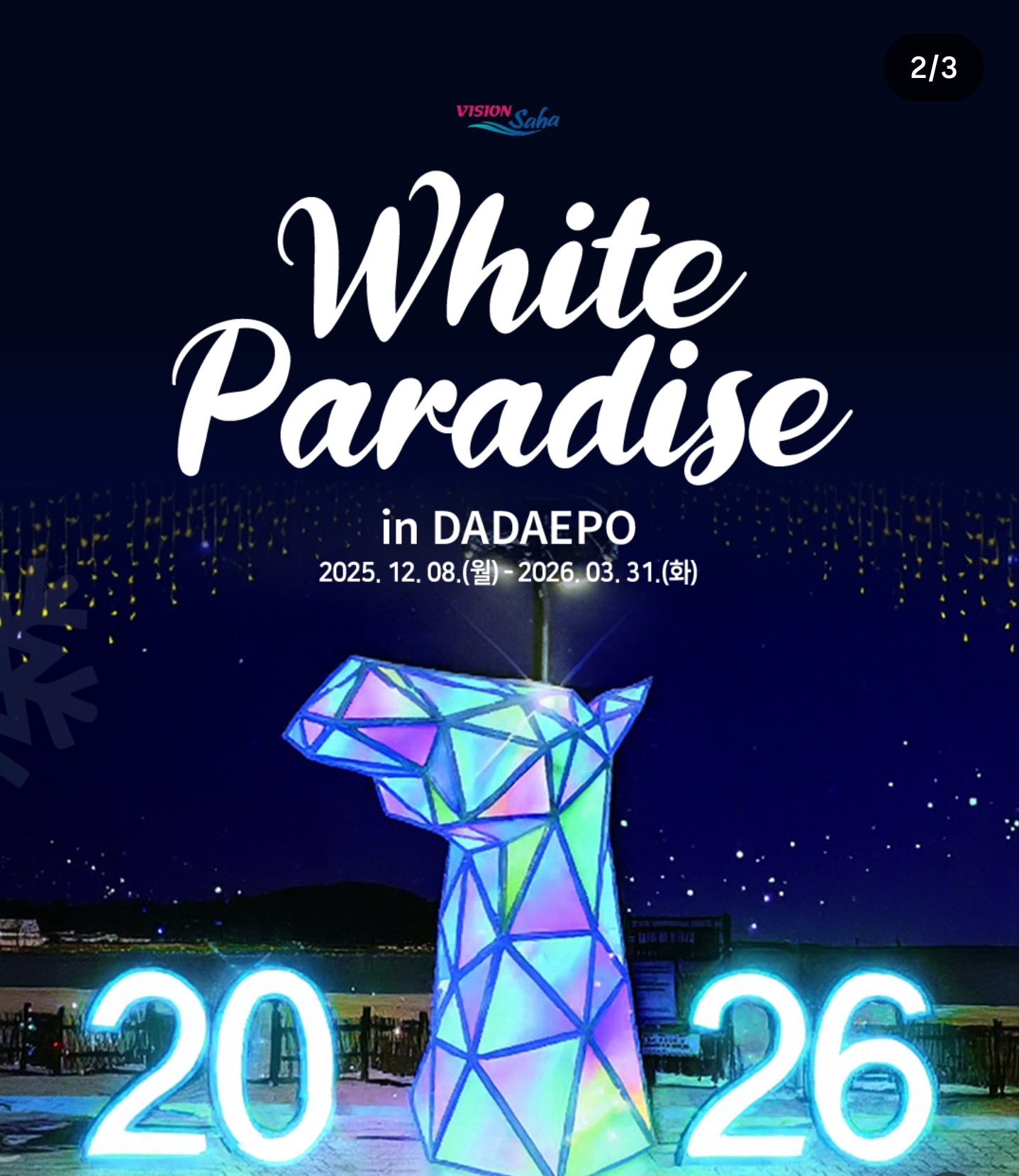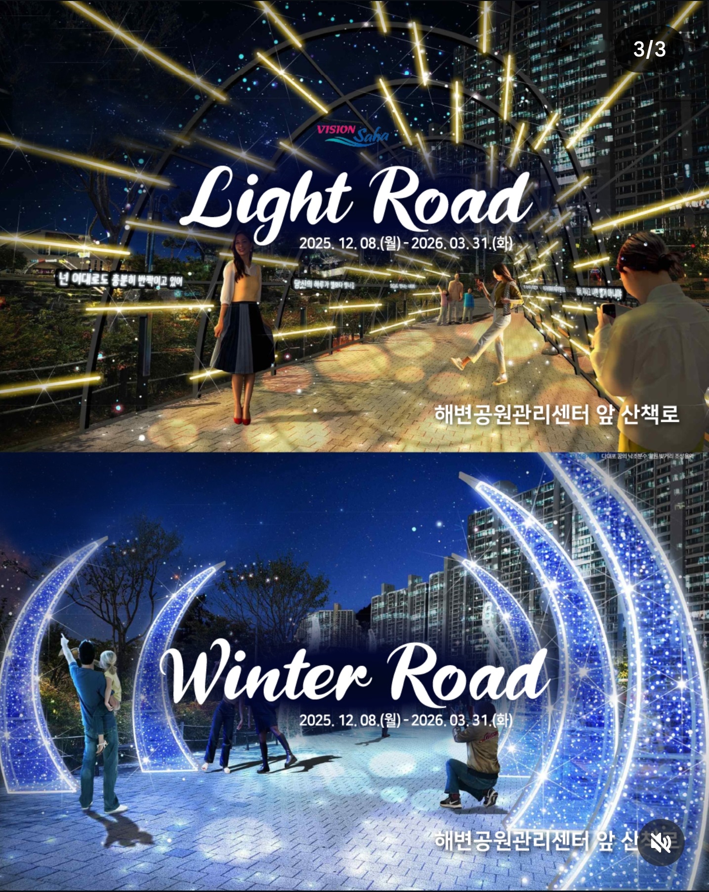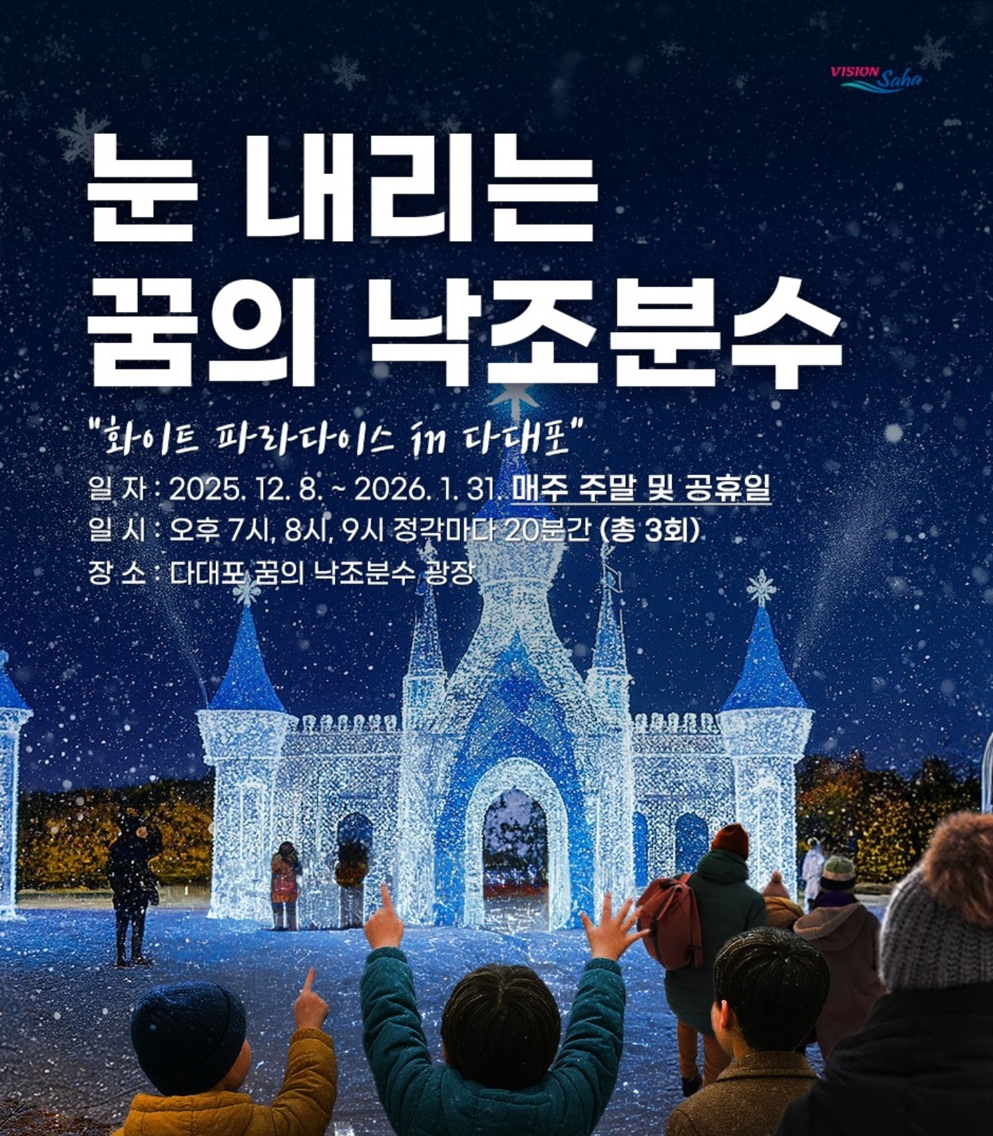 12월부터 3월까지 약 4개월간 매주 주말과 공휴일마다 반짝이는 이 특별한 순간, 놓치지 마세요! 지금 바로 주말 스케줄 확인하시고, 연인·가족과 함께 다대포로 떠나보세요! 겨울밤 바다와 빛이 만들어내는 낭만, 평생 잊지 못할 추억이 될 거예요! 💙🌟