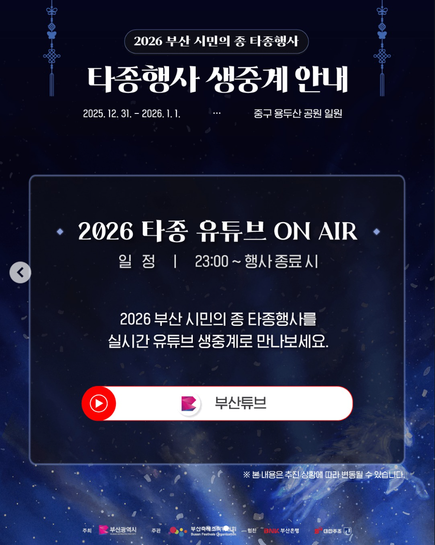 현장에 가기 어렵다면 걱정 마세요! 2026 부산 시민의 종 타종행사는 온라인 생중계로도 만나볼 수 있어요. 📺 부산시 공식 유튜브 채널 '부산튜브(@Busan_is_good)'와 부산문화관광축제조직위원회 공식 유튜브 채널(@busan_festival)에서 실시간으로 생중계됩니다. 집에서 따뜻하게, 혹은 멀리 떨어진 타지에서도 부산의 새해 첫 순간을 함께할 수 있죠. 💻 생중계로 보면서도 댓글로 다른 시청자들과 새해 인사를 나누고, 타종 순간을 캡처해 SNS에 공유하는 재미도 쏠쏠해요! 부산문화관광축제조직위원회 공식 홈페이지(festivalbusan.com/busanbell)와 인스타그램에서도 행사 전 상세 정보와 비하인드 스토리를 확인할 수 있으니, 팔로우 필수입니다! 📲